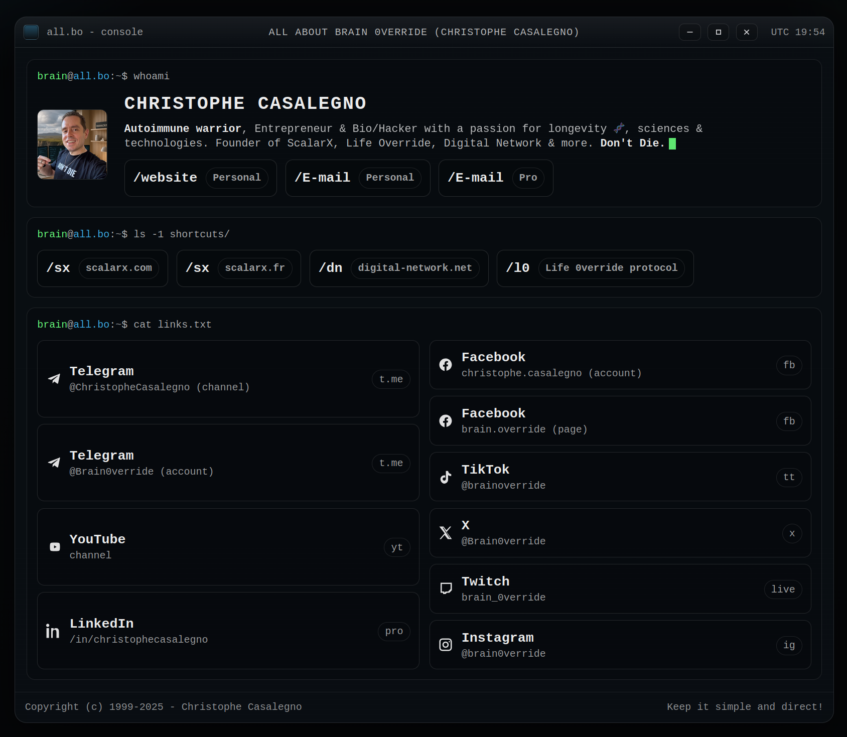 « All About Brain 0verride ». Mon « Linktree » perso, pour centraliser tout ce qui me concerne, mes sites, mes réseaux, etc.